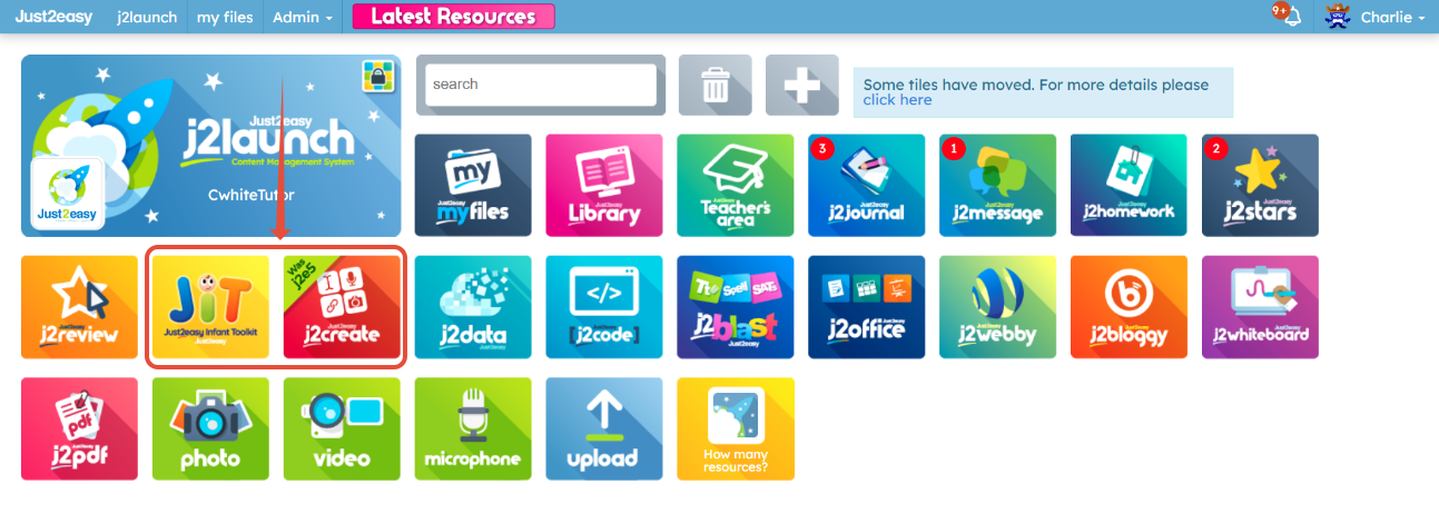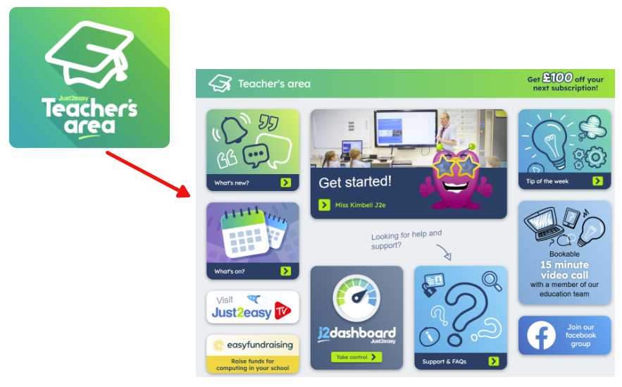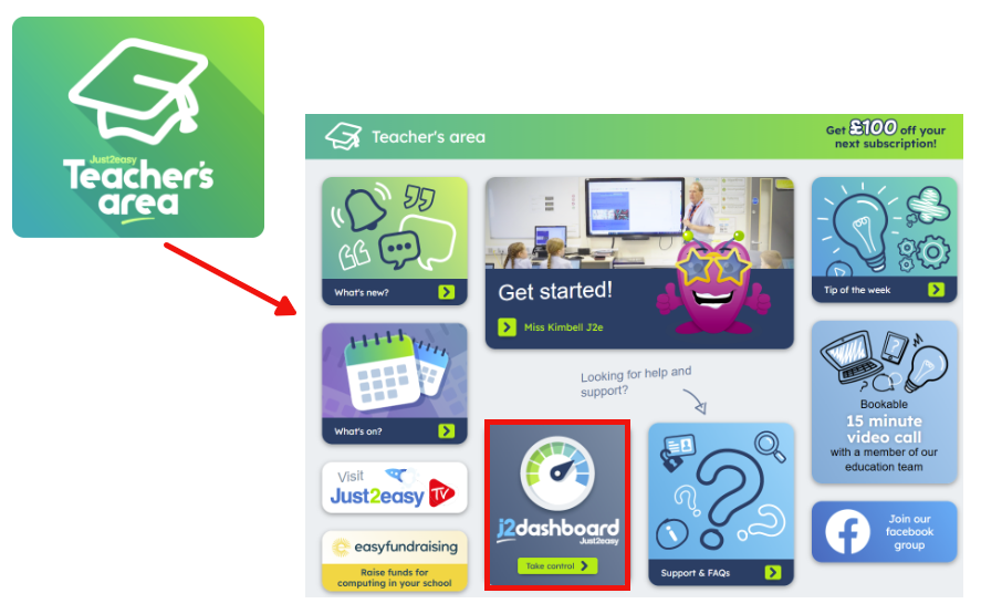 Dashboard, Help tile, Training opportunities, Live lessons, Just2easy TV YouTube link and Just2easy.com