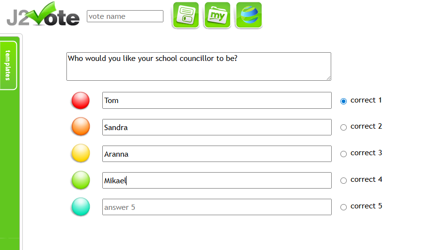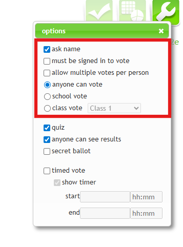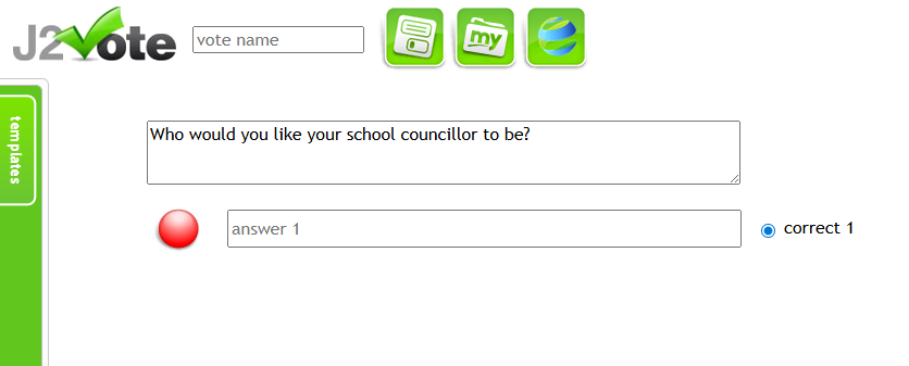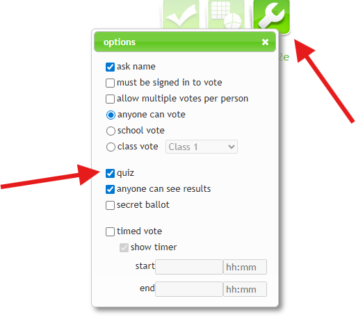 - You can customise your j2vote by clicking the spanner icon in the top right corner. From here, you can choose whether to set it up as a quiz (with one correct answer) or as a voting activity/poll. :